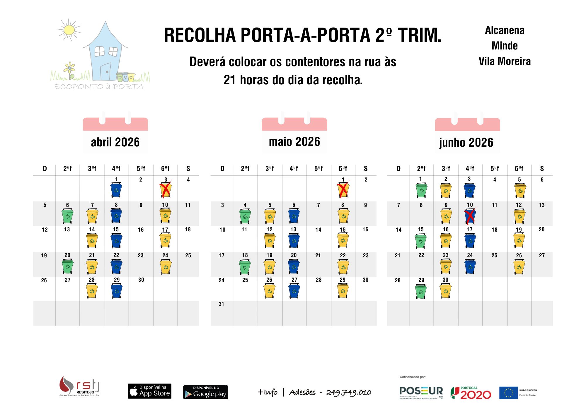 Foi implementada a recolha seletiva porta-a-porta de embalagens em fogos domésticos em Alcanena e Vila Moreira. Este projeto está a ser desenvolvido em estreita articulação com o município de Alcanena no âmbito da candidatura aprovada pelo POSEUR 2020. Informações e adesões: 249 749 010 ou porta-a-porta@rstj.pt