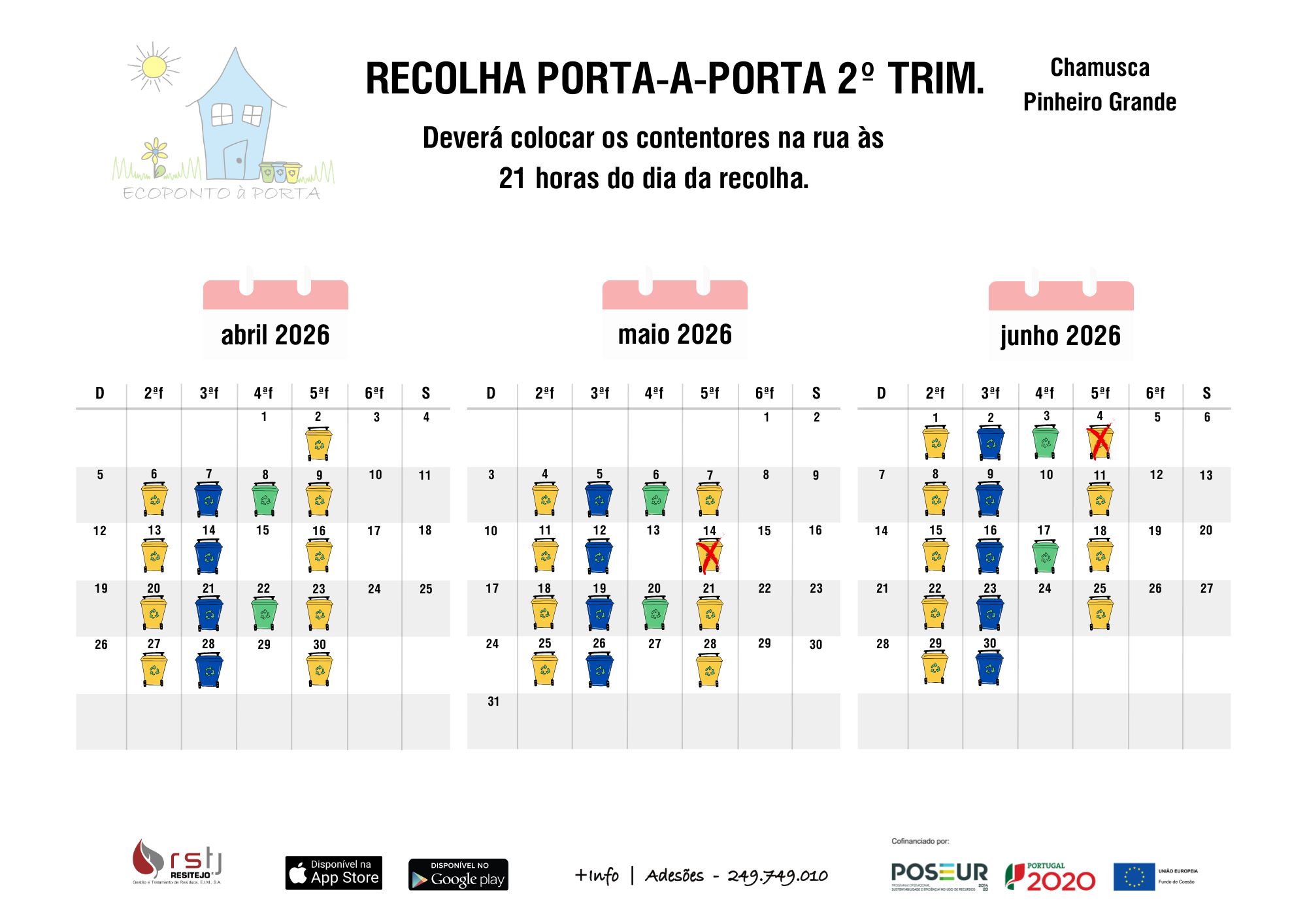 Foi implementada a recolha seletiva porta-a-porta de embalagens em fogos domésticos na Vila da Chamusca. Este projeto está a ser desenvolvido em estreita articulação com o município da Chamusca no âmbito da candidatura aprovada pelo POSEUR 2020. Informações e adesões: 249 749 010 ou porta-a-porta@rstj.pt